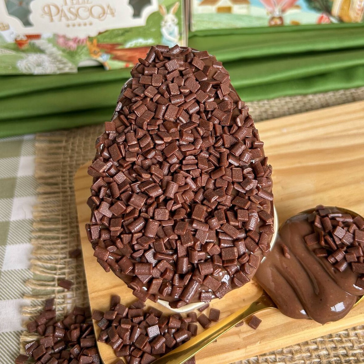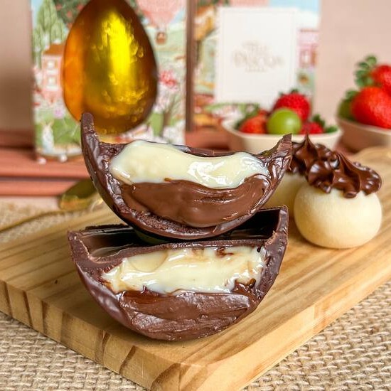 Ovo colher; feito com chocolate meio amargo, recheado com duas camadas de brigadeiro 50% cacau, feito com chocolate nobre Sicao, e uma camada generosa de Nutella pura no meio;