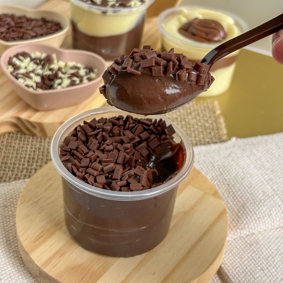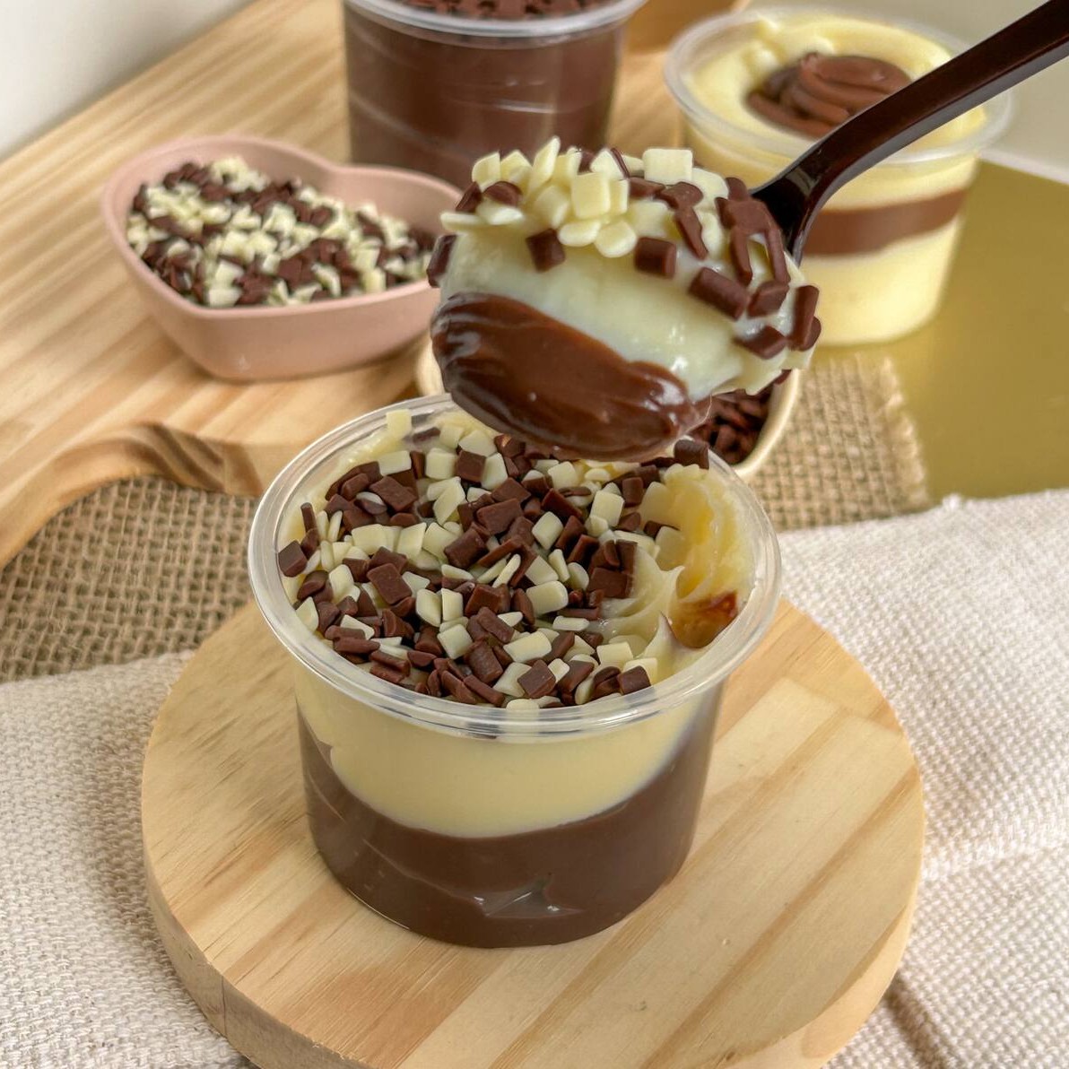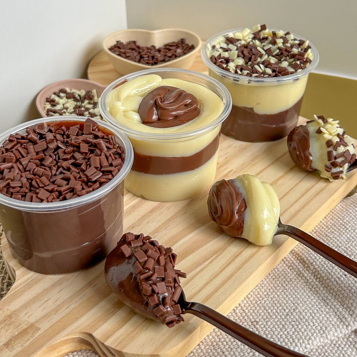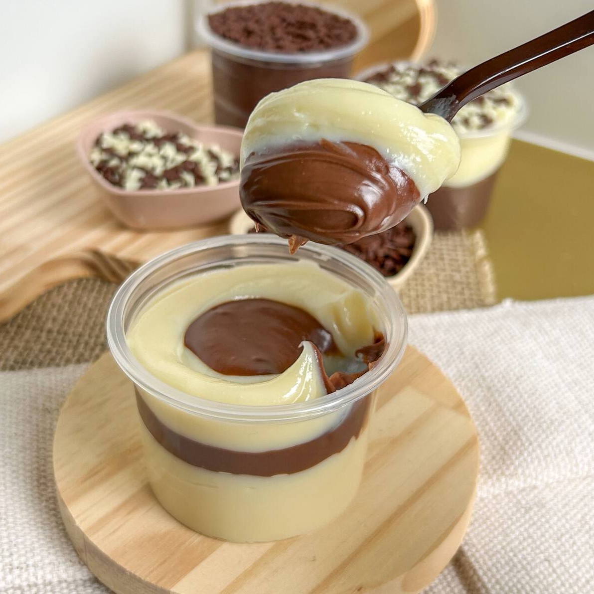 Pote 3: Uma camada de brigadeiro 50% cacau, feito com chocolate Nestlé, e uma camada de brigadeiro de leite Ninho, o casadinho perfeito; finalizado com muito granulé premium de chocolate ao leite, e chocolate branco!