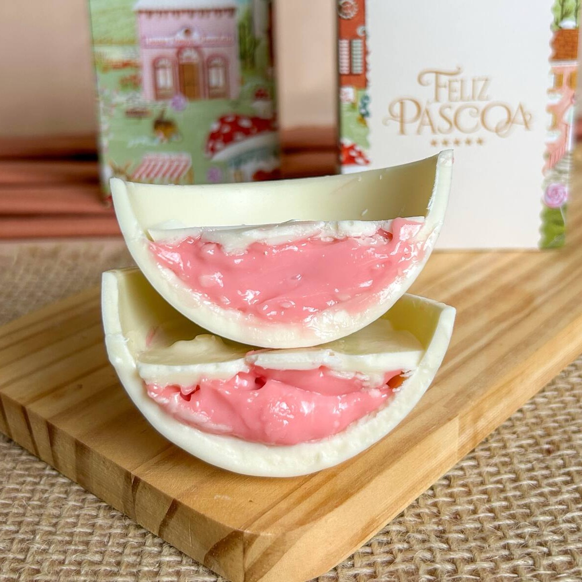 Casca de ovo de chocolate branco, recheado com brigadeiro de Nesquik, com sabor nostálgico;