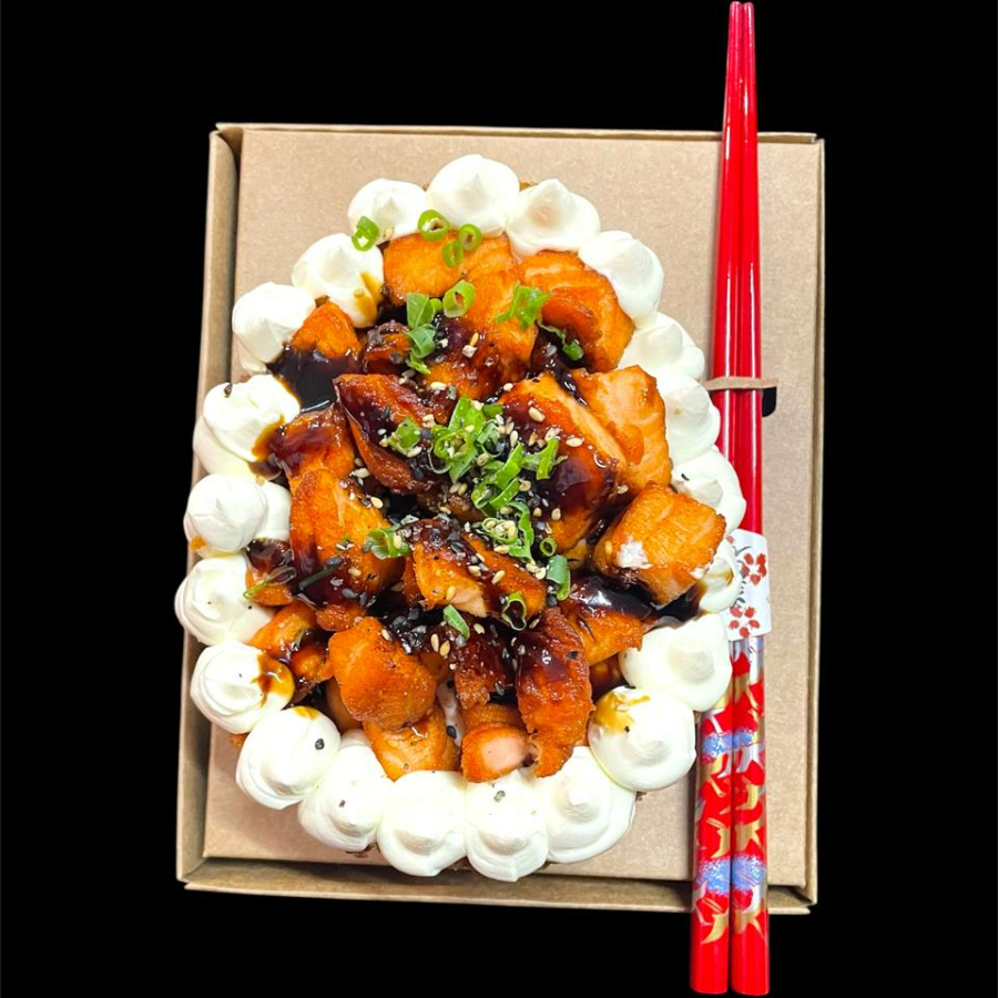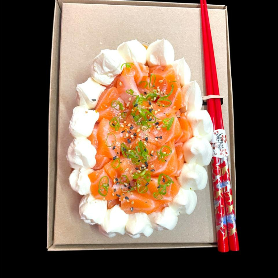 salmao em cubos chean chesse ,manga ,kani,pepino japones crisp de alho poro