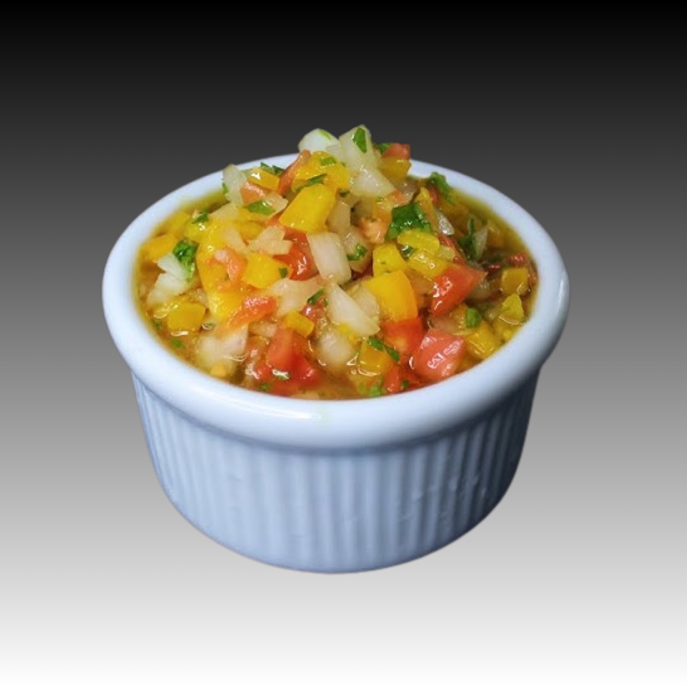 Espeto do miolo da alcatra bovina com cebola, bacon e pimentão acompanhado por arroz, mandioca, vinagrete, farofa crocante e molho verde.