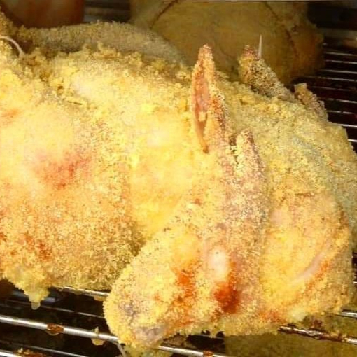 FOTO PROPRIA/Maior frango da região. Frango empanado em farinha de milho, recheado com deliciosa farofa de farinha mandioca com cebola caramelizada no capricho. - assado/inteiro/unidade.