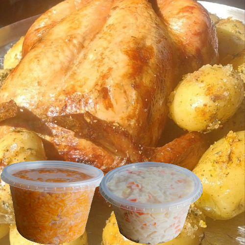 Frango tradicional recheado com farofa acompanhado .com risoto de frango, batatinha assada e deliciosa maionese. FOTO PROPRIA.