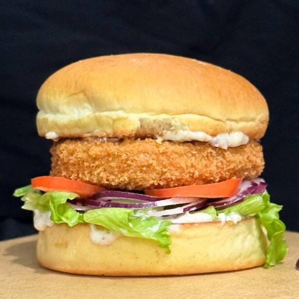 Pão brioche, maionese artesanal de bacon, hambúrguer empanado de frango, alface, tomate e cebola roxa picadinha.