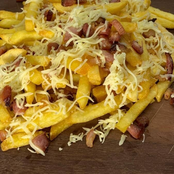 A nossa 'Porção de Batatas Fritas Especiais' é uma experiência gastronômica única. Adicionamos generosas lascas de bacon frito e saboroso, cobrindo tudo com uma camada de queijo mussarela derretido. Essa maravilha, que é uma explosão de sabores, está categorizada entre as nossas porções individuais, mas é tão irresistível que você vai ter dificuldades em compartilhar. É a combinação perfeita de texturas e sabores para satisfazer o seu paladar.
