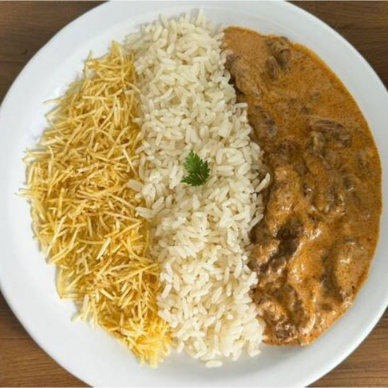 1 marmita M com arroz, batata palha e strogonoff de carne