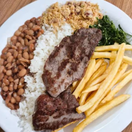 1 marmita G com arroz, feijão branco, bife na chapa, couve refogada, farofa, batata frita , vinagrete