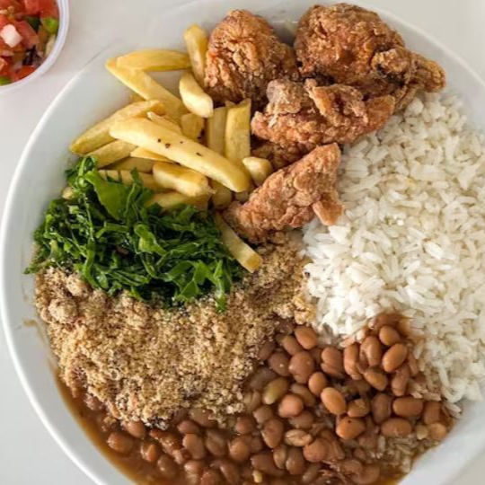 1 marmita G com arroz, feijão branco, frango frito , couve refogada, farofa, batata frita , vinagrete