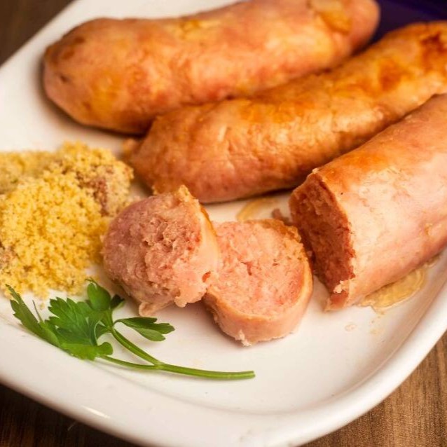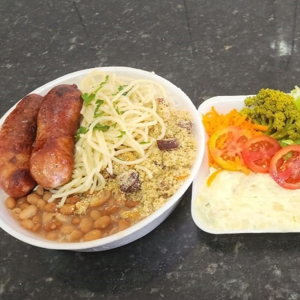 Linguiça toscana acompanhada de arroz, feijão branco, farofa com bacon e calabresa, macarrão alho e óleo. Acompanha salada e maionese.