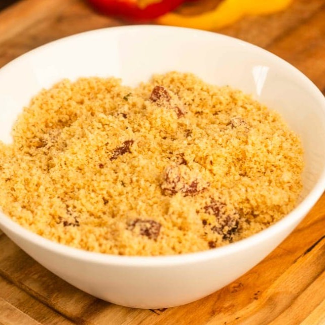 Delicioso Recheio: farofa de milho, com bacon e calabresa.