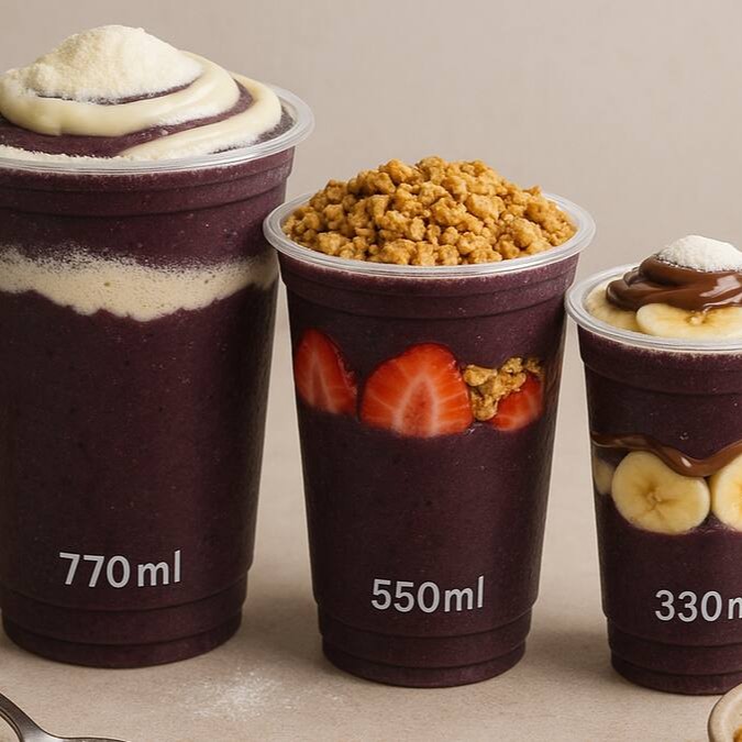 Copo de 770 ml com açaí cremoso e 6 acompanhamentos grátis para criar a combinação perfeita do seu sabor favorito.