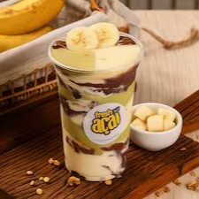 Açaí cremoso com leite condensado, creme de avelã, trufa de Ninho, creme de pistache, Banana frescos e leite em pó.