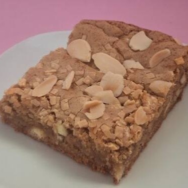 Delicioso brownie artesanal no sabor Chocolate Branco, com gotas de chocolate branco e amêndoas na massa! Macio, cremoso e com aquela casquinha maravilhosa!