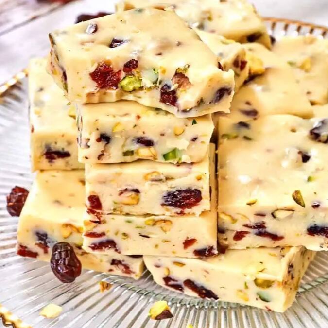 Fudge de Chocolate Branco com Cranberries e Pistache: Um fudge irresistível feito com delicioso chocolate branco, cranberries secas e crocantes pistaches. Uma combinação perfeita de sabores e texturas que vai conquistar seu paladar. Experimente! (60g)