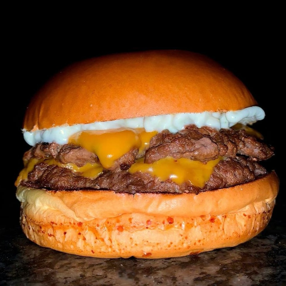 Pão brioche macio e fofinho selado na manteiga, 2 smash burguers 90g cada, fatias de queijo cheddar e nossa deliciosa maionese da casa.