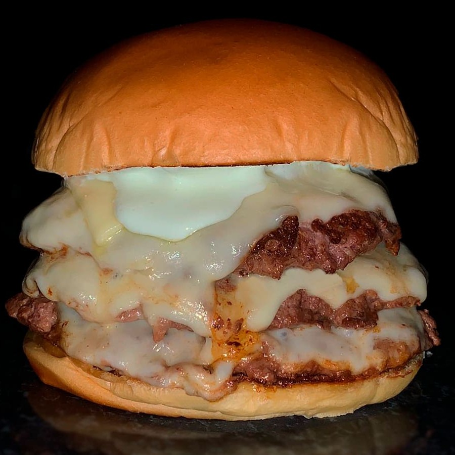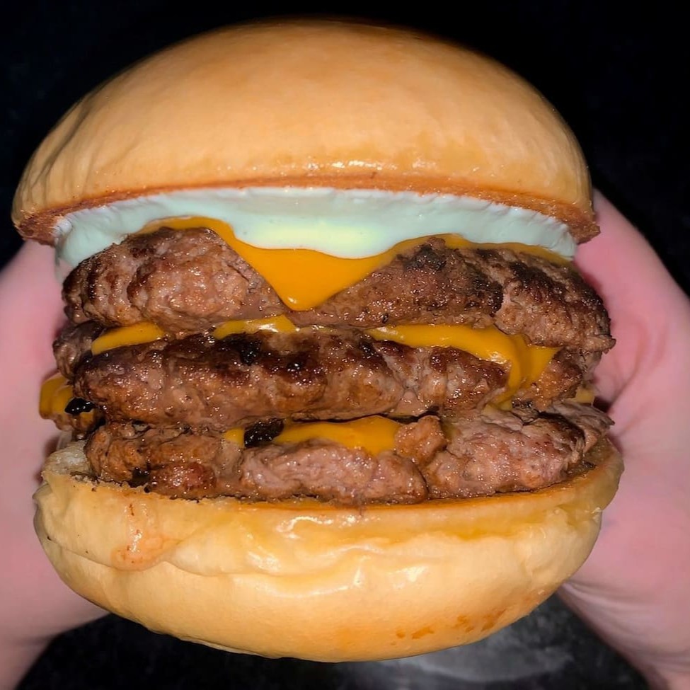 Pão brioche selado na manteiga, 3 camadas de carne de 90g cada (blend da melhor qualidade), 3 fatias de queijo cheddar e nossa deliciosa maionese artesanal.