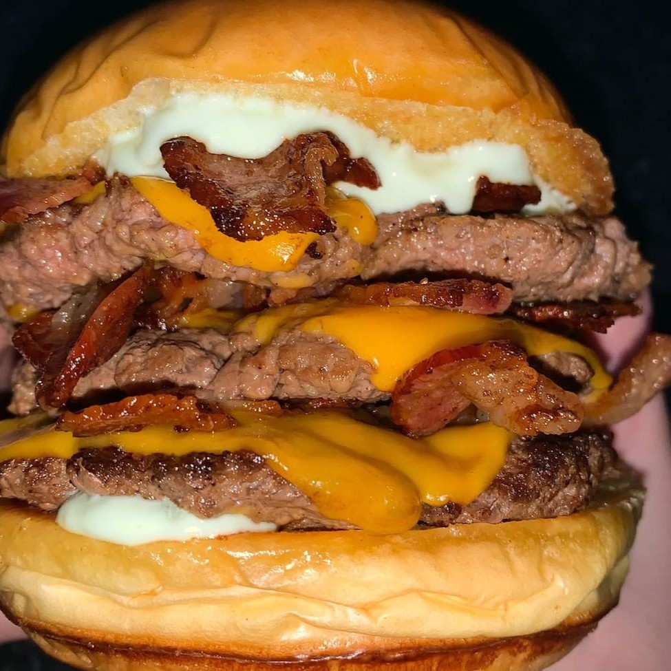 Pão brioche selado na manteiga, 3 camadas de carne de 90g cada (blend da melhor qualidade), 3 fatias de queijo cheddar, fatias de bacon e nossa deliciosa maionese artesanal.