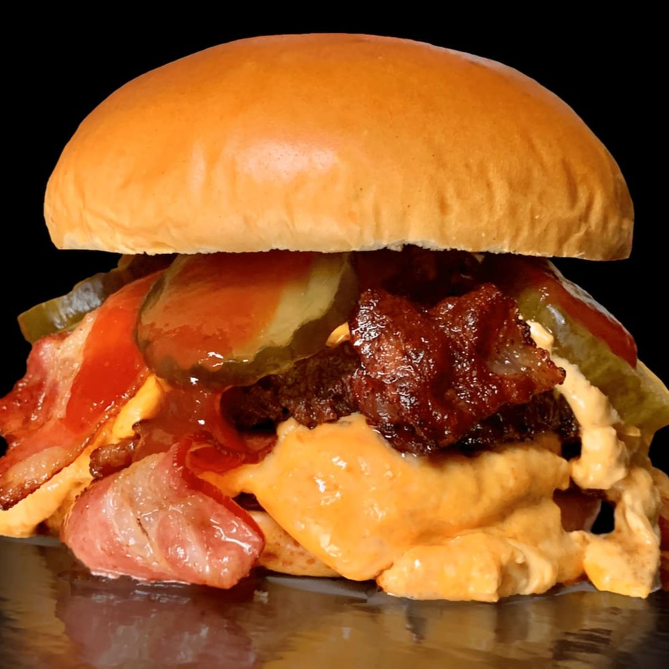 Pão brioche selado, 2 camadas de carne 100gr cada, fatias de bacon, picles agridoce, molho cheddar e ketchup.