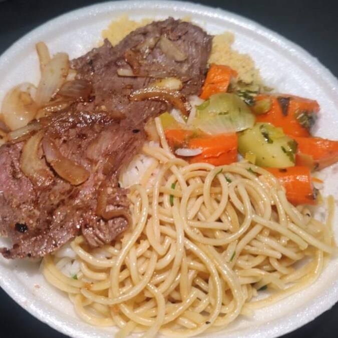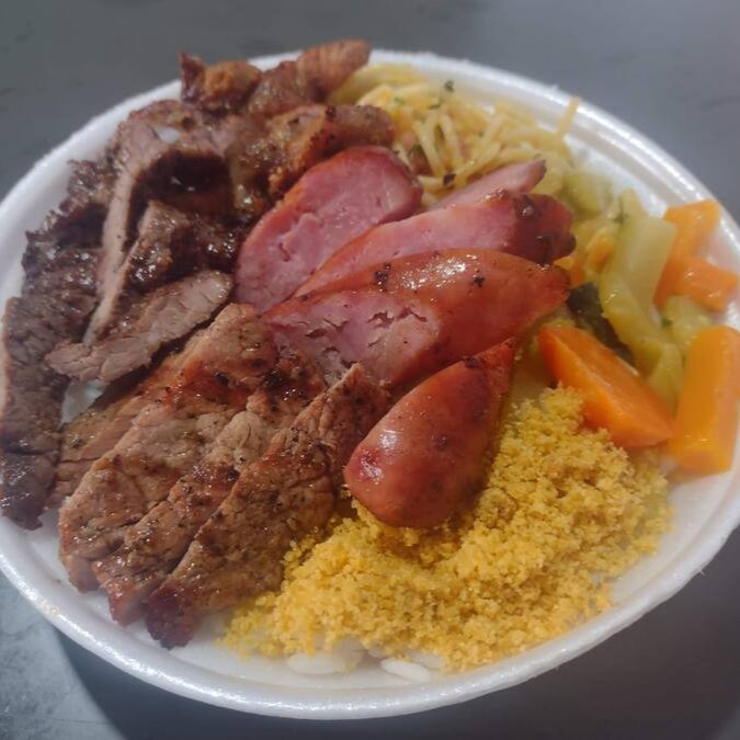Delicioso e Suculento Churrasco misto (Alcatra, Pernil e Linguiça), servido com Arroz Branco Soltinho, Feijão Caseiro, Farofa, Salada Fresca e Batata Frita!!! Opção de trocar a Batata frita por legumes do Dia caso queira colocar na observação.