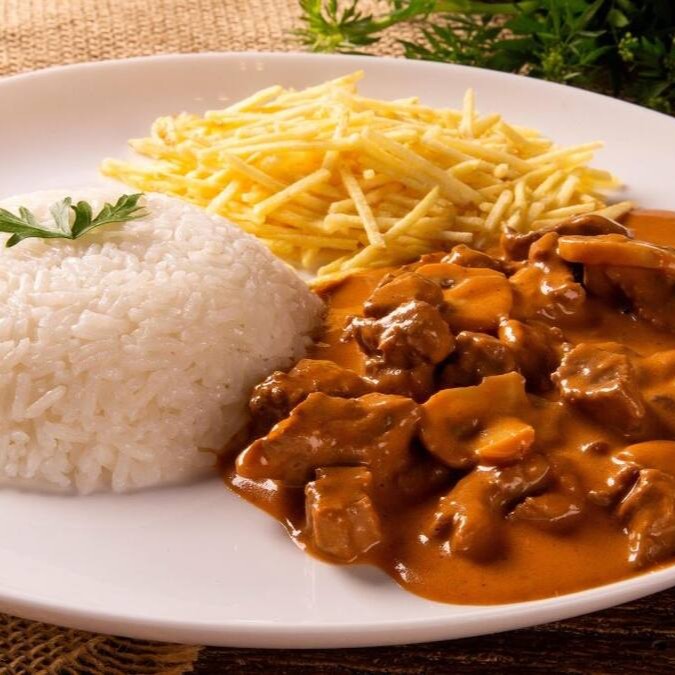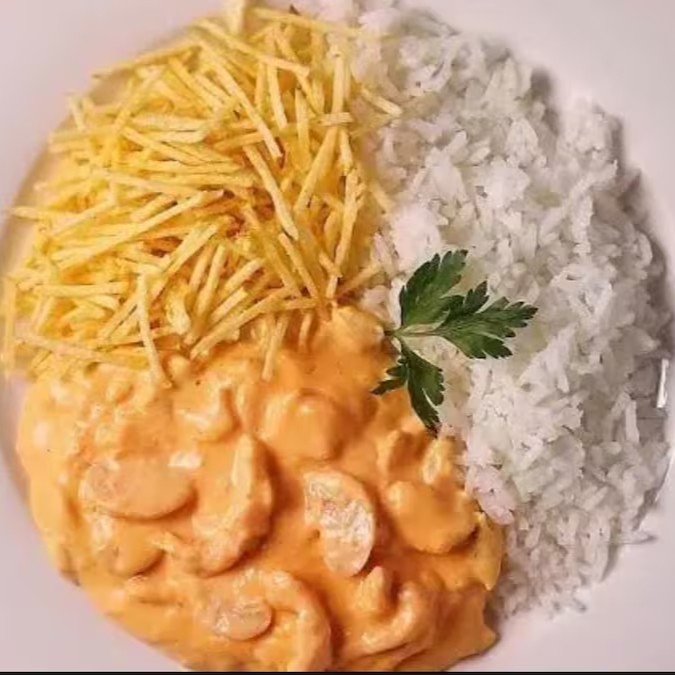 Delicioso estrogonofe servido com arroz soltinho e batata Palha.