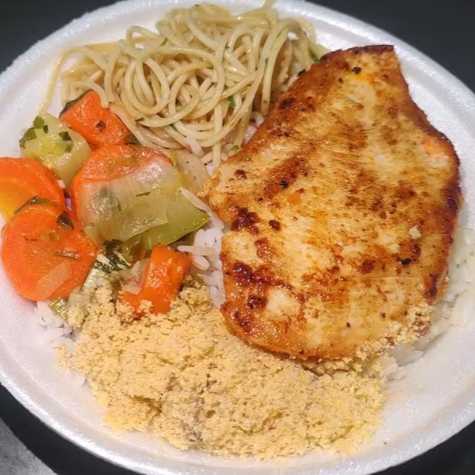 Delicioso File de Tilapia a Grelhada servido com arroz soltinho feijão fresquinho batata frita farofa e salada