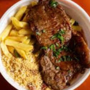 Delicioso e suculento contra file servido com arroz soltinho, feijão fresquinho batata frita, farofa e salada.