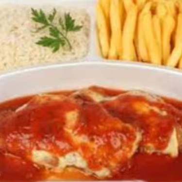Deliciosa Parmegiana de frango servida com arroz soltinho batata frita e salada