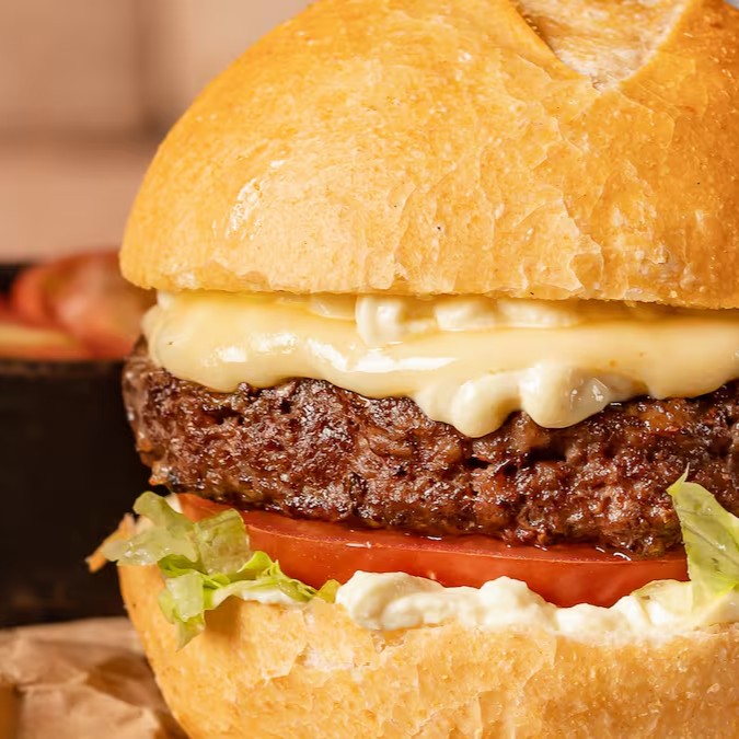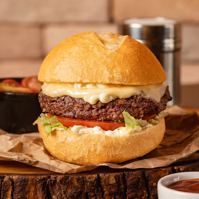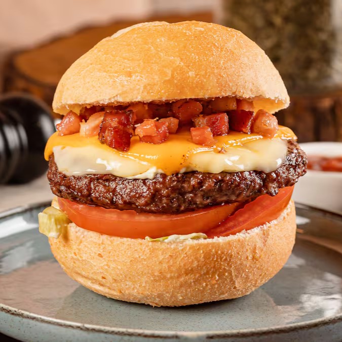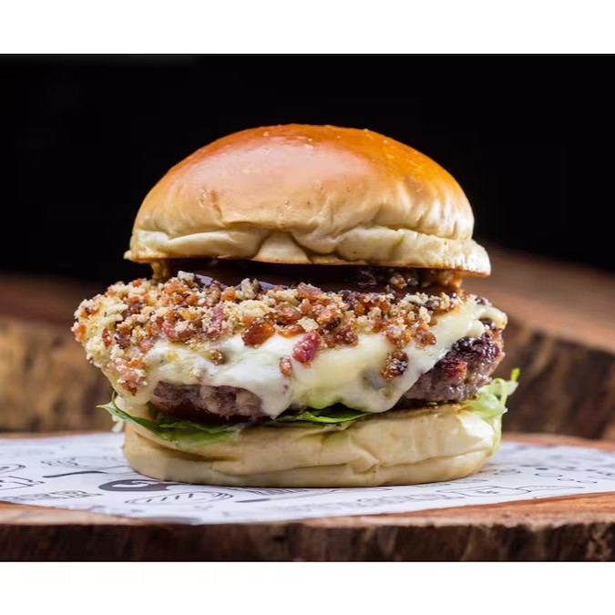 Um Delicioso Blend de Costela & Bacon moído, Pão de Brioche, Barbecue, Alface Americana, Queijo Mussarela e uma irresistivel Farofinha de Bacon Crocante!