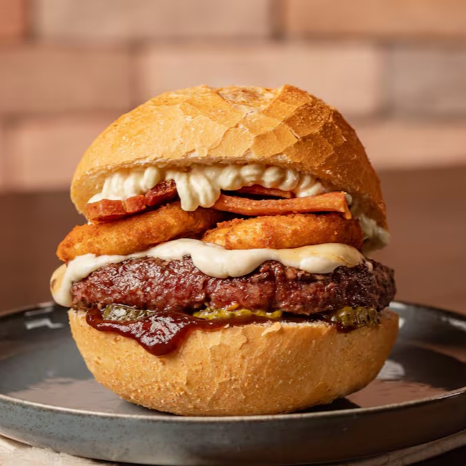 Esse é o nosso delicioso burguer bovino assado na brasa, barbecue, pickles, maionese da casa, mussarela, bacon crocante e deliciosas onion rings.