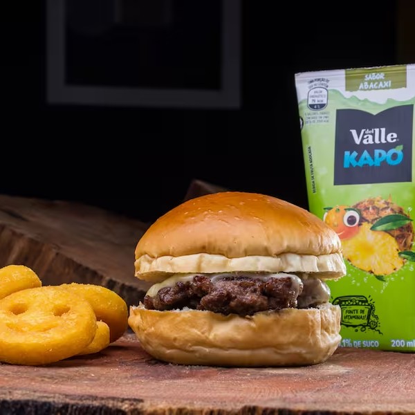 Hamburguer de costela 150gr. Mussarela, cream cheese e maionese da casa, acompanha um suco kapó 200ml e uma porção de batata smile pequena.