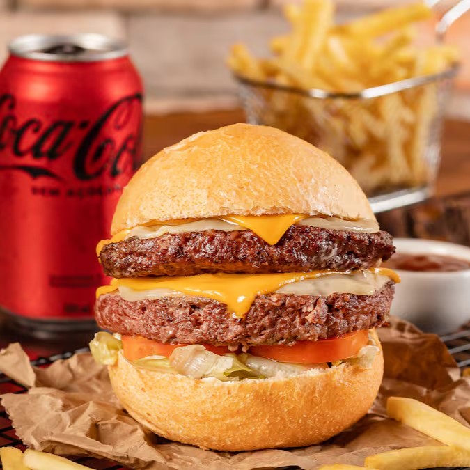 Um Maravilhoso lanche com 2 Hamburguer Artesanal 180g assadas na brasa ,bacon, mussarela, cheddar fatiado, alface, tomate, cream cheese, molho verde e maionese da casa tudo em dobro. Acompanha um refrigerante lata 350ml. E uma porção pequena de batata.
