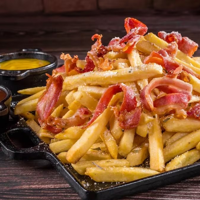 Deliciosa porção de Batata c/ Aproximadamente 400g batata, temperada c/ sal , lemon pepper e muito Bacon crocante
