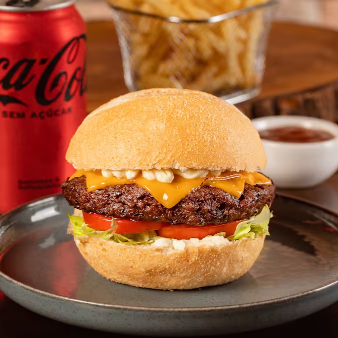 Nossa suculenta carne de costela 180gr. Assado na brasa, bacon, mussarela, cheddar, cream cheese, maionese da casa, alface e tomate.), uma porção de batata individual e 1 refrigerante lata 350ml.