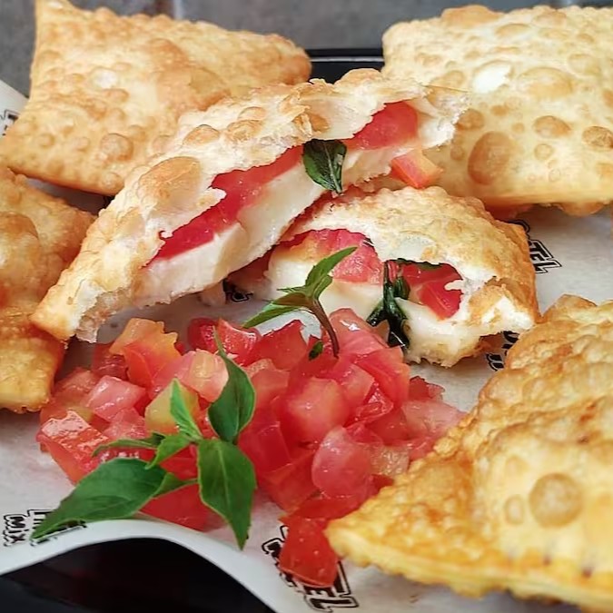 “Pastel de carne seca no capricho: crocância por fora, recheio irresistível por dentro. Uma explosão de sabor que vai conquistar você em cada mordida!”