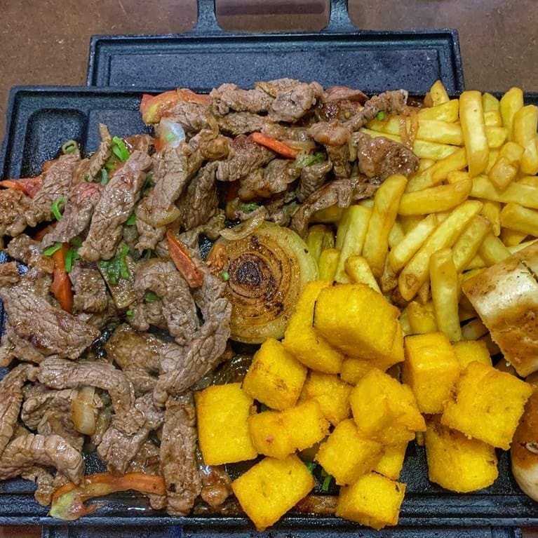 Alcatra na Chapa 500g com cebola e tomate Batata Frita 500g Polenta ou Aipim 500g (Cliente Escolhe na observação) Pão de Alho 1 unid Farofa Temperada Maionese de Alho! Serve 4 Pessoas.