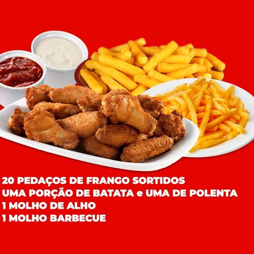 20 pedações de frango sortidos, uma porção inteira de batata frita, (600g) uma porção inteira de polenta frita (600g). 1 Molho de Alho e 1 Barbecue! *cliente pode mudar a porção de acompanhamento ex: (trocar a porção de polenta ou batata) Atenção Senhores Clientes, As Porções São Pesadas Antes De Serem Fritas