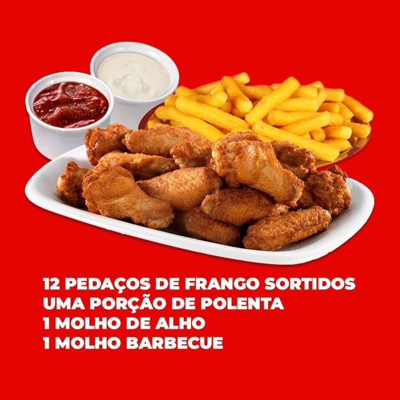 12 pedações de frango sortidos, uma porção inteira de polenta frita (600g) 1 Molho de Alho e 1 Molho Barbecue *cliente pode mudar a porção de acompanhamento ex: (trocar a porção de polenta por batata)