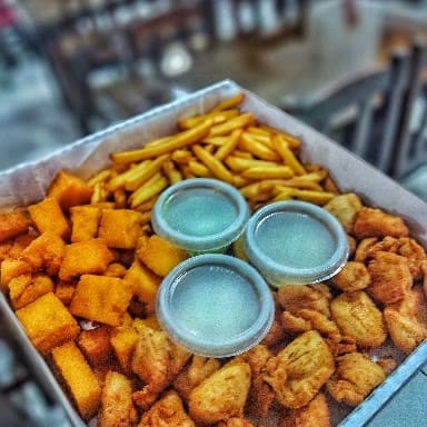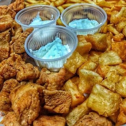 500g de Iscas de Peito de Frango, 500g de Batata Frita e 500g de Polenta Frita. + 2 molhos