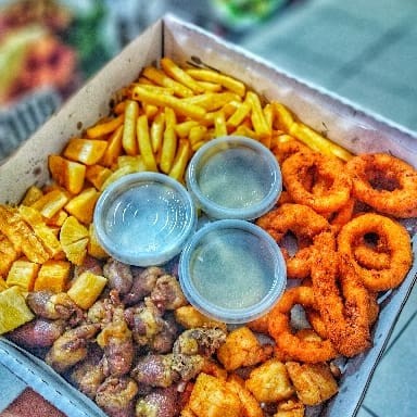 São 250g de Iscas de Frango Frito 250g de Aipim 250g de Batata Frita 250g de Aneis de Cebola 250g de Coraçãozinho de Frango! Acompanha Molho barbecue e molho de Alho! Todas embaladas e enviadas na Caixa! *Atenção Senhores Clientes, As Porções São Pesadas Antes De Serem Fritas, Vindo A Diminuir Após o Preparo*