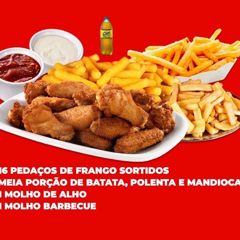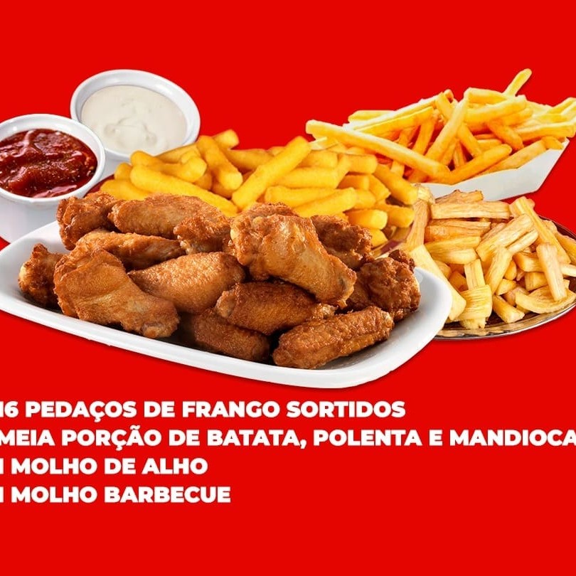 16 pedações de frango sortidos, meia porção de batata frita, (400g), meia porção de polenta frita (400g) meia porção de mandioca frita (400g). 1 Molho de Alho e 1 Molho Barbecue. *Atenção Senhores Clientes, As Porções São Pesadas Antes De Serem Fritas, Vindo A Diminuir Após o Preparo*