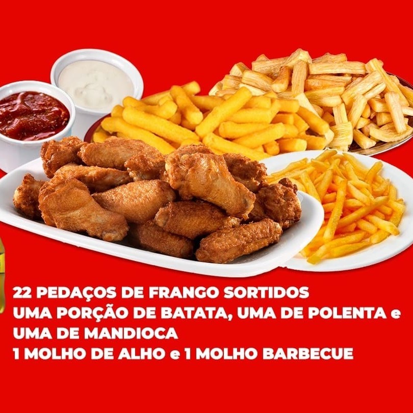 22 pedações de frango sortidos, uma porção inteira de batata frita,(600g), uma porção inteira de polenta frita (600g) e uma porção inteira de mandioca frita (600g) 1 Molho de Alho e 1 Molho Barbecue. Atenção Senhores Clientes, As Porções São Pesadas Antes De Serem Fritas