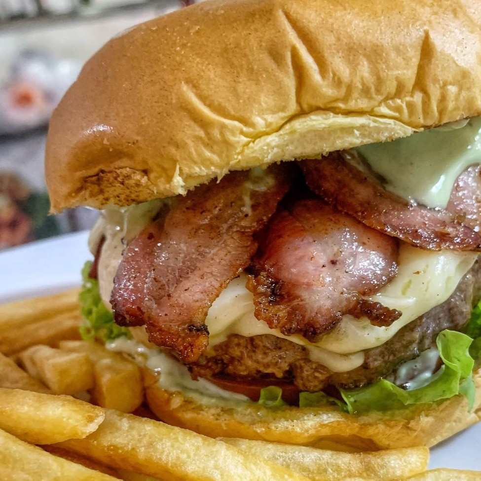 Pão, molho, hamburguer de 150g, queijo mussarela, fatias de bacon, alface americana e tomate *acompanha batata frita*