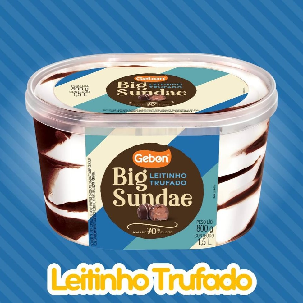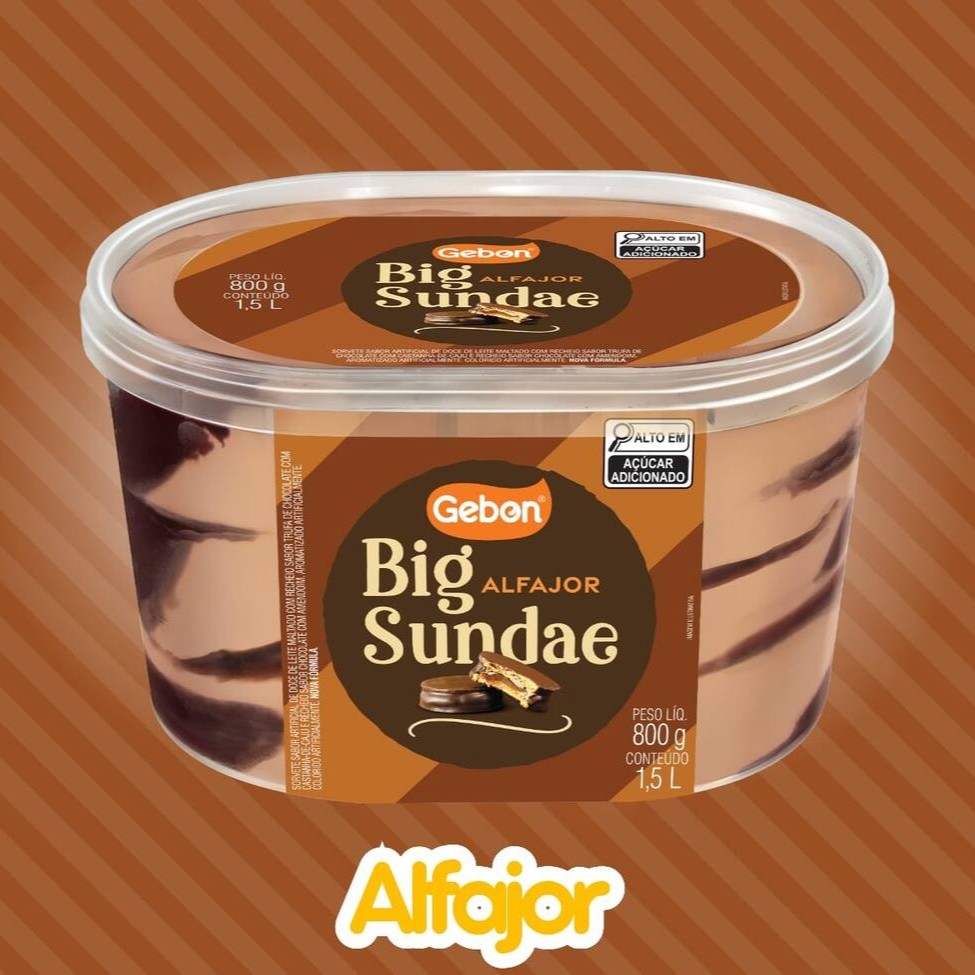 Delicioso sorvete Gebon da linha Big Sundae no pote de 1,5l. Alfajor O intenso sabor do doce de leite envolvido em um recheio de chocolate com notas de castanhas. Sorvete incrível. Momento incrível. Contém Lactose. Contém Glúten