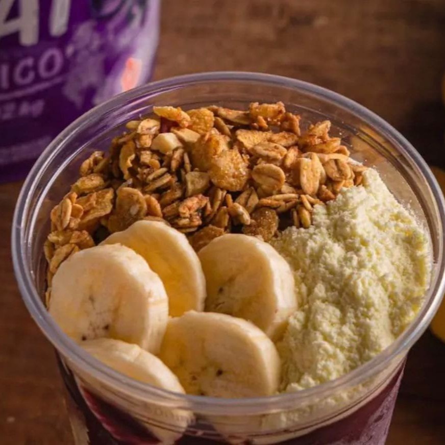 200 grande de açaí acompanha 20 gramas de granola crocante.