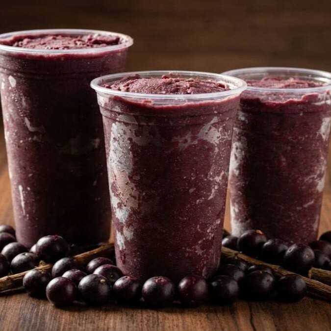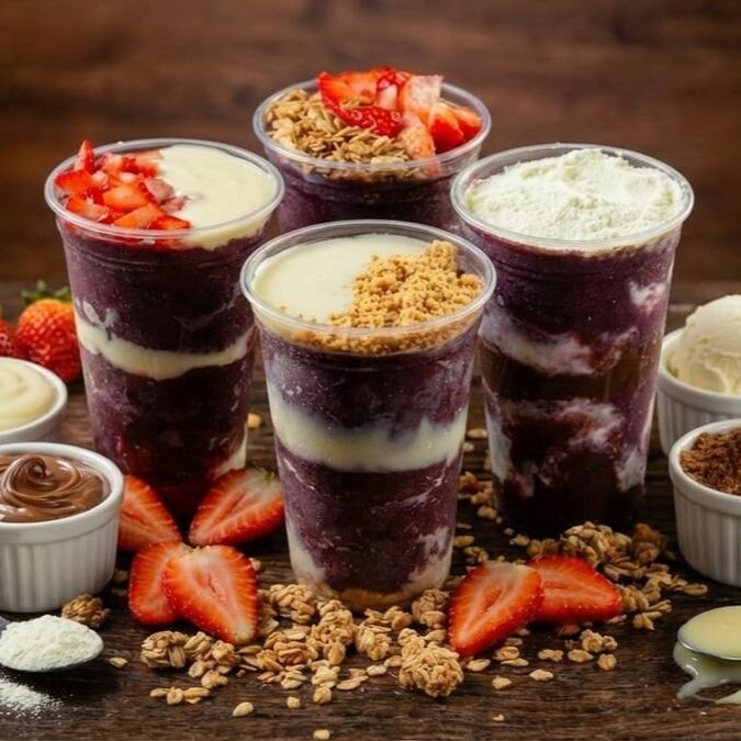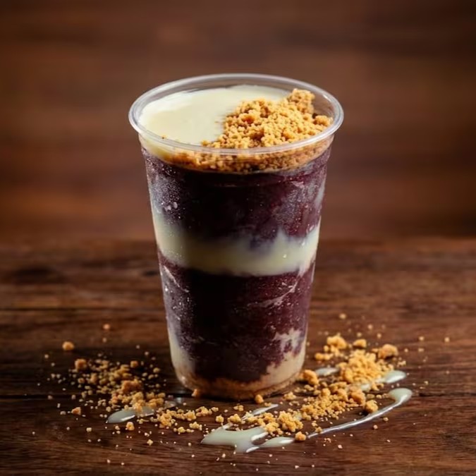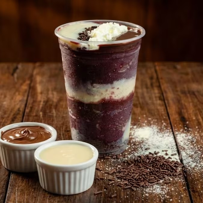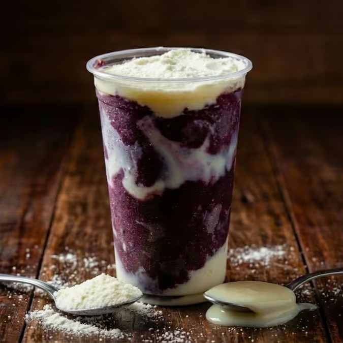Açaí Casadinho no copo de 300ml: Açaí + Cupuaçu + Leite Condensado + Banana + Leite em Pó.