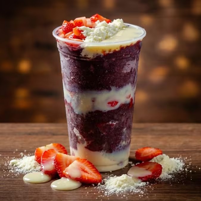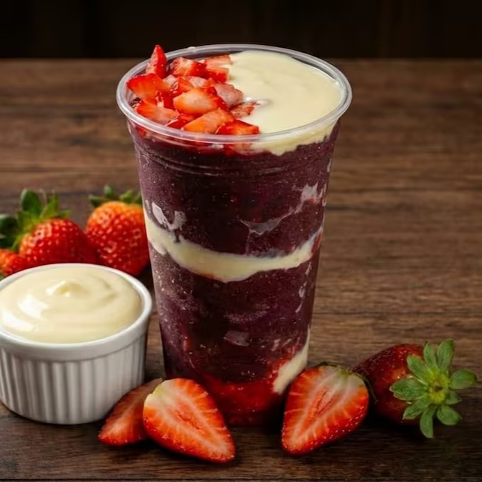 Açaí no copo de 500 ml : Açaí + Leite em Pó + Leite Condensado + Morango