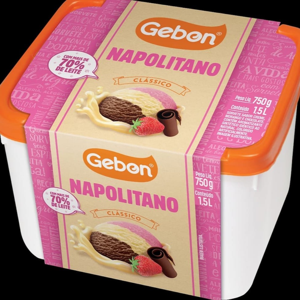 Pote de 1,5 litros sorvete napolitano, chocolate, creme e morango.