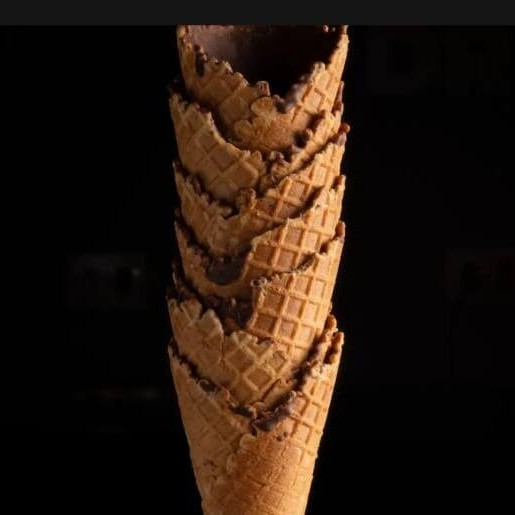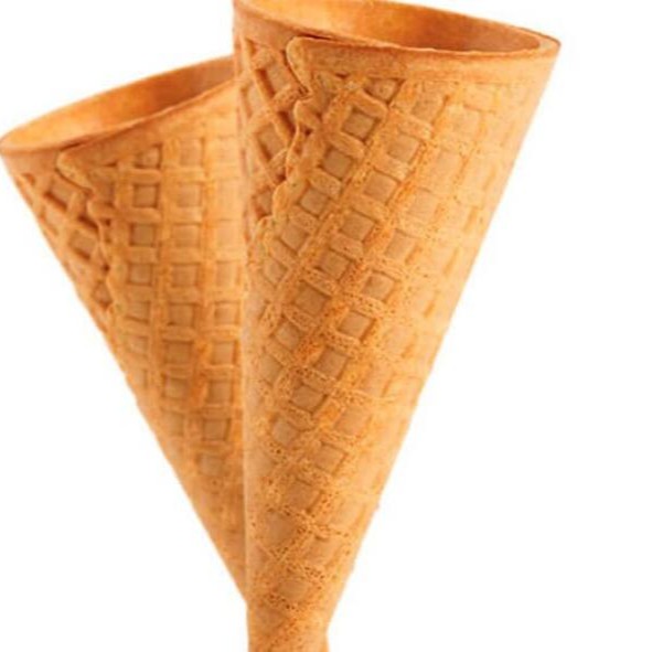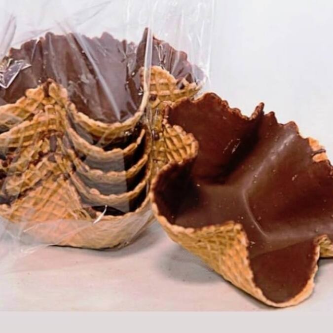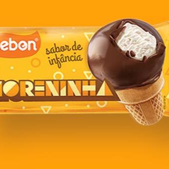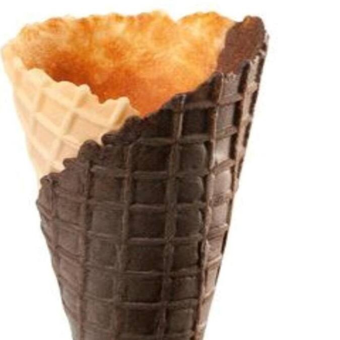 Sorvete de quatro leites com cobertura de chocolate ao leite em casquinha de biscoito doce.