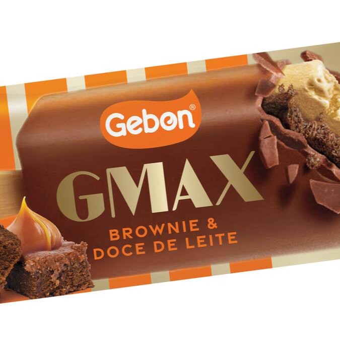 Picolé Gmax Brownie 80g sorvete sabor de doce de leite maltado com brownie de chocolate e cobertura crocante de chocolate meio amargo.