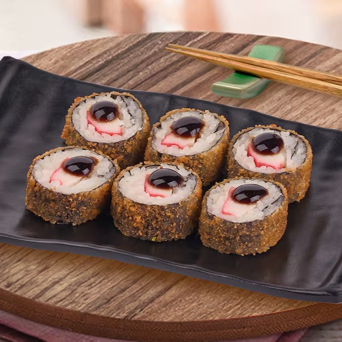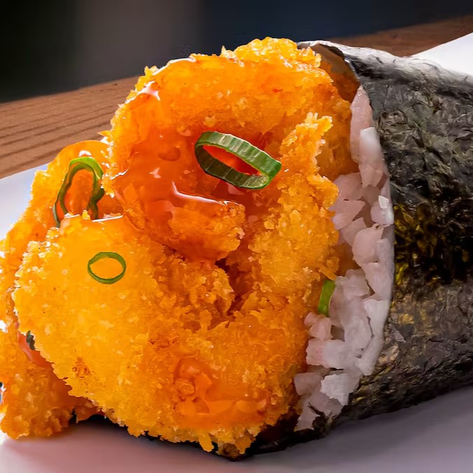 Arroz de sushi (shari) envolto em alga nori, recheado com camarão empanado, cream cheese, cebolinha, finalizado com molho sweet chilli (Prato Frio).